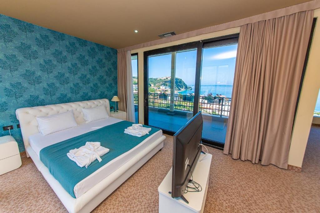 All rooms are fitted with air-conditioning, a minibar, a seating area and a flat-screen TV. Private bathroom provides a shower. Most rooms overlook the sea.